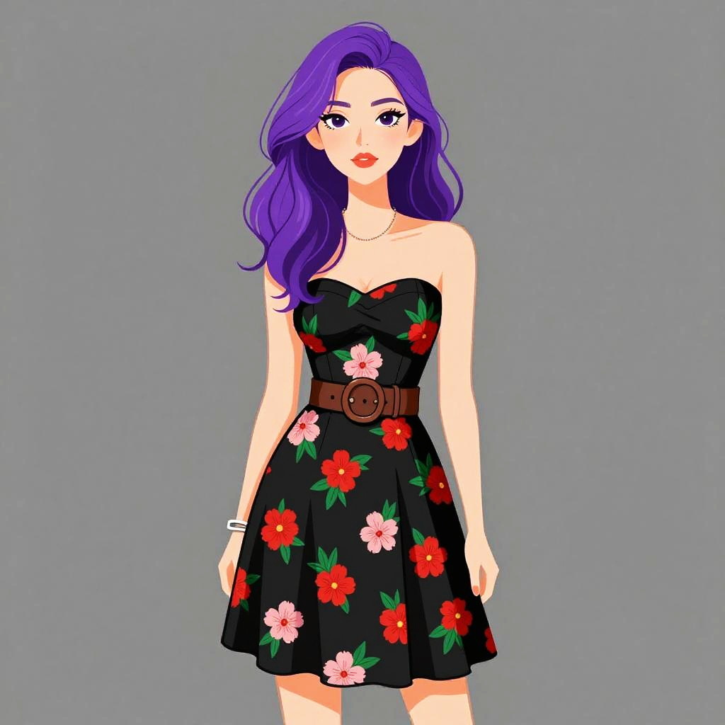 Woman with pretty face and pretty hair. Woman, playful chic, short red wrap dress with ruffle detailing, v-neckline, short flutter sleeves, self-tie waist belt, thigh-length hemline, minimalist silver hoop earrings, hair up in a messy bun, white background. --sref 1467