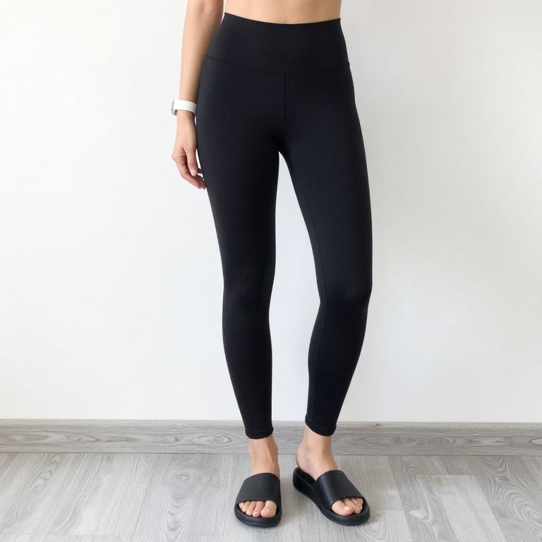 Photograph of a person standing, showing from midriff to ankles. They're wearing high-waisted, black, form-fitting leggings and black open-toe slide sandals. Their left hand rests on their hip, and they have a white wristband on their right wrist. The background is a plain white wall with a grayish wooden floor at the bottom. The lighting is bright and even.