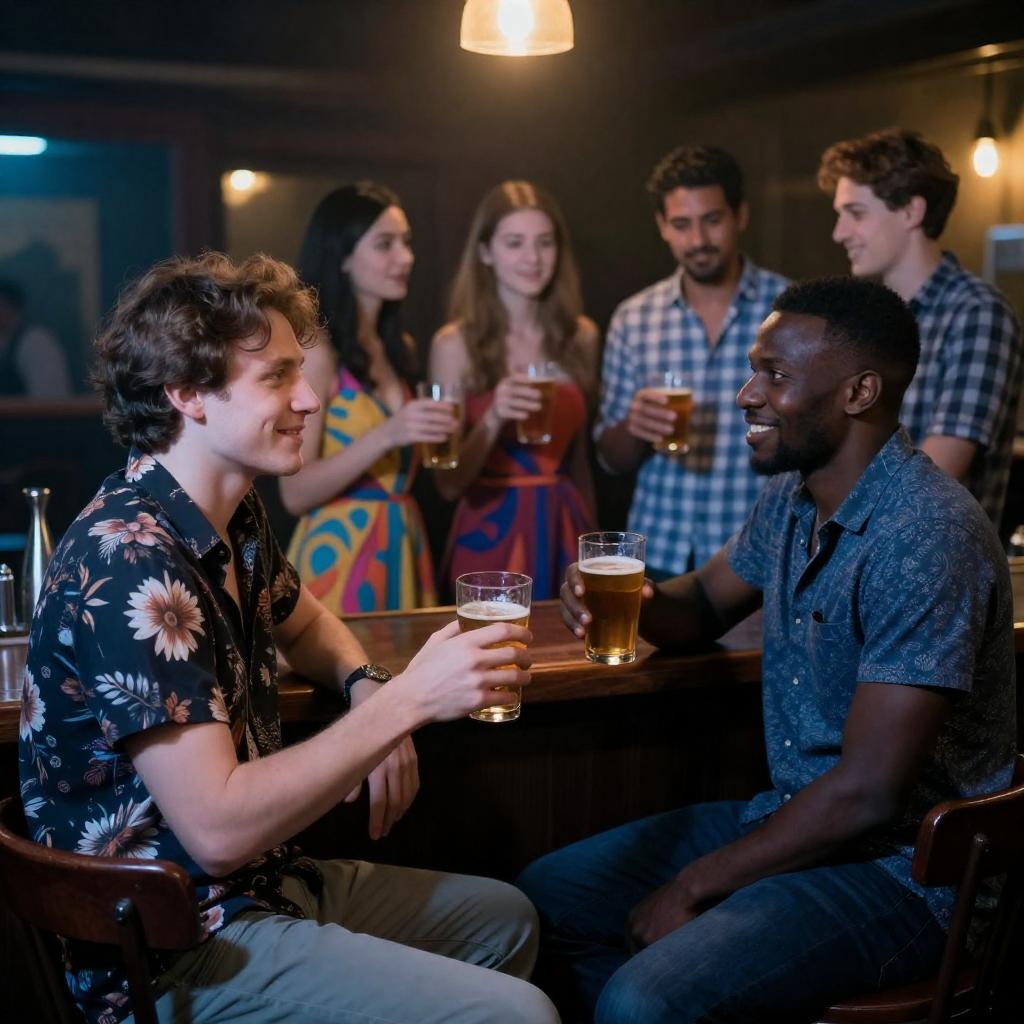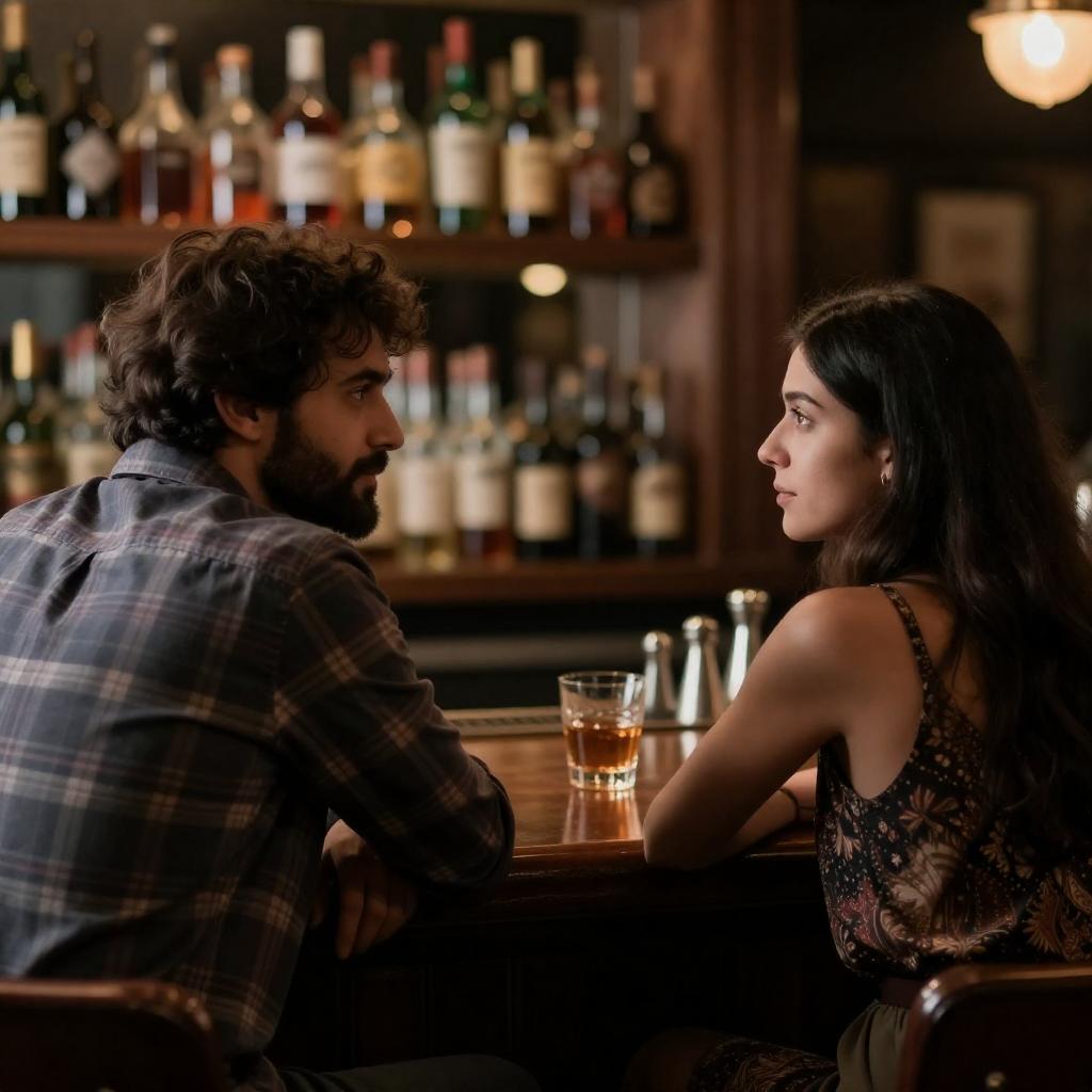 Photograph of a dimly lit bar with a man and woman interacting. The man, with short blonde hair and a floral shirt, stirs a drink on the wooden bar. The woman, with long black hair and a black leather jacket, sits opposite him. Neon purple and blue lights illuminate the background shelves filled with bottles. A silver statue is centered on the bar.