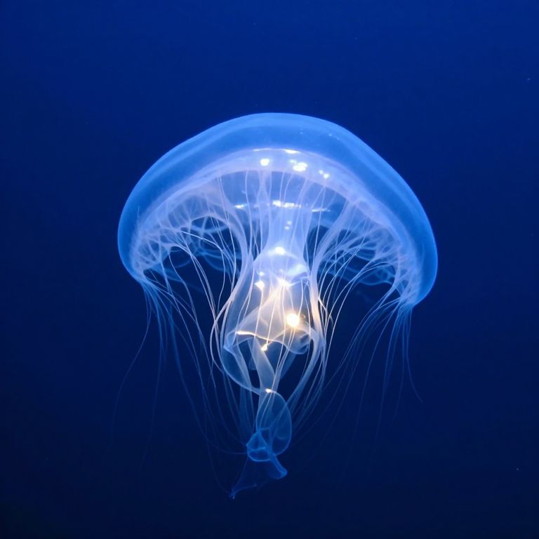 A luminous cluster of translucent spheres, each glowing with ethereal light, floats serenely in the deep blue abyss, its delicate tendrils trailing like threads of moonlight through the ocean's depths.
