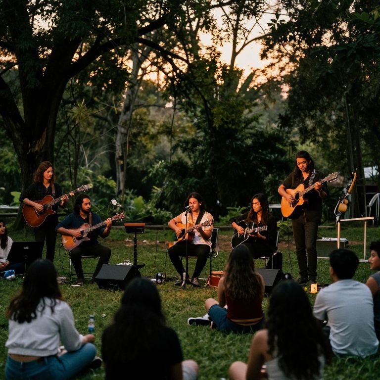 Caifanes outdoor concert at dusk in a lush Mexican forest clearing, soft golden light filtering through trees, band immersed in their music, natural surroundings adding serene and magical aura, fans sitting on the grass, intimate and soulful scene.