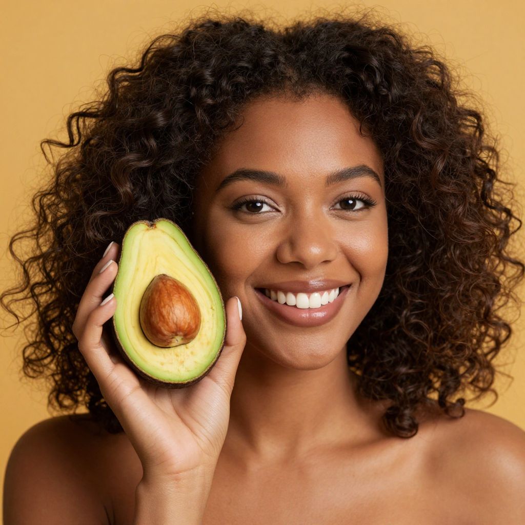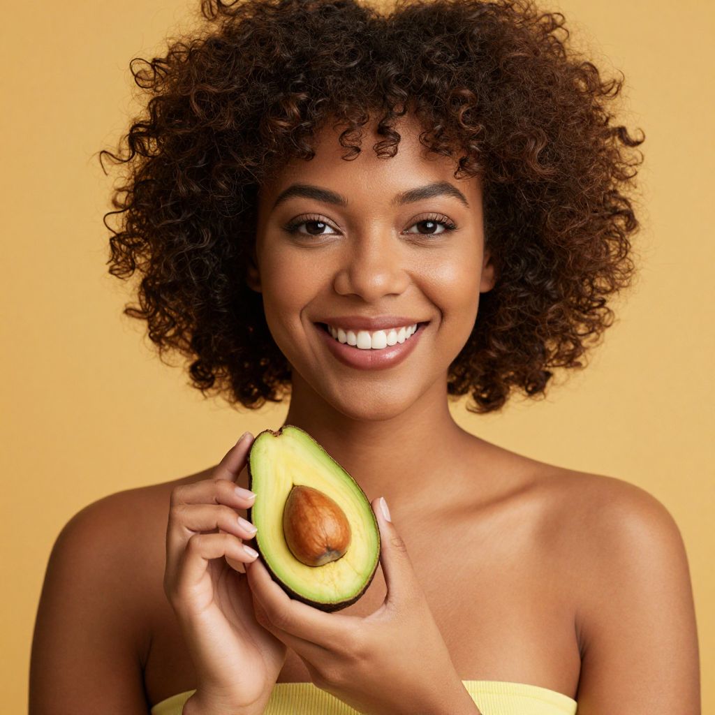 Smiling African American woman with curly hair holds a halved avocado, showcasing its vibrant green flesh and brown pit against a warm yellow background.