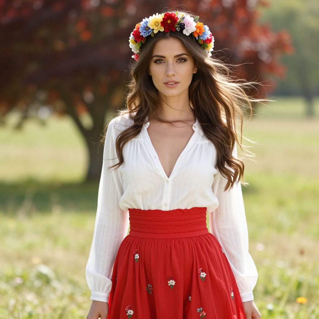 Photograph of a young woman with long brown hair, wearing a white, slightly sheer, button-down blouse with a deep neckline, and a bright red, high-waisted skirt with small floral embroidery. She has a colorful flower crown and stands in a sunlit meadow with a red-leaved tree in the background. Her hair is gently blowing in the breeze, giving a soft, romantic vibe.