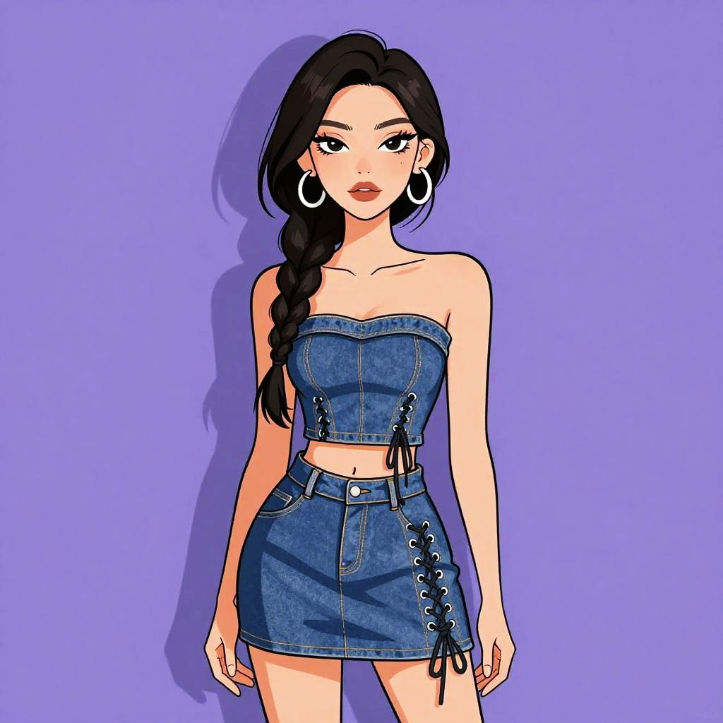 Woman with pretty face and pretty hair. Woman, contemporary chic, burgundy off-the-shoulder bodysuit with a high neck and long sleeves, paired with a black faux leather mini skirt, diagonal zipper detail, high waistline, plain beige photo studio background. --sref 1467