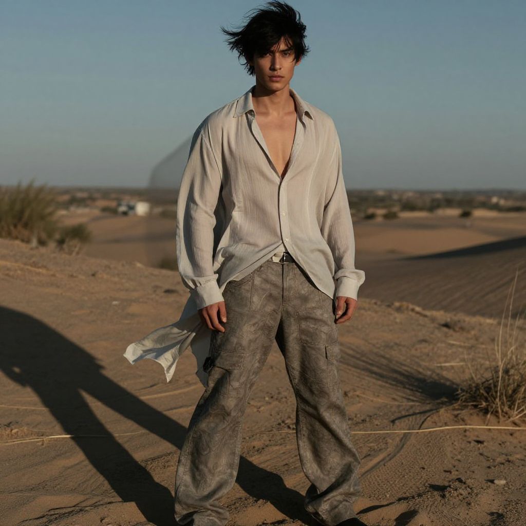 Male model with black hair posing outdoors in a windswept desert environment, wearing a flowing light fabric shirt and rugged pants, dramatic shadows and natural light creating a dynamic and cinematic atmosphere, high fashion shoot.