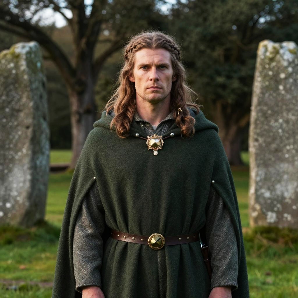Portrait of an 11th century Irish king wearing a traditional cloak pinned with a brooch, standing in a lush, rocky Irish forest with ancient standing stones, his long hair braided, intense eyes looking forward, illuminated by soft sunlight filtering through the trees.