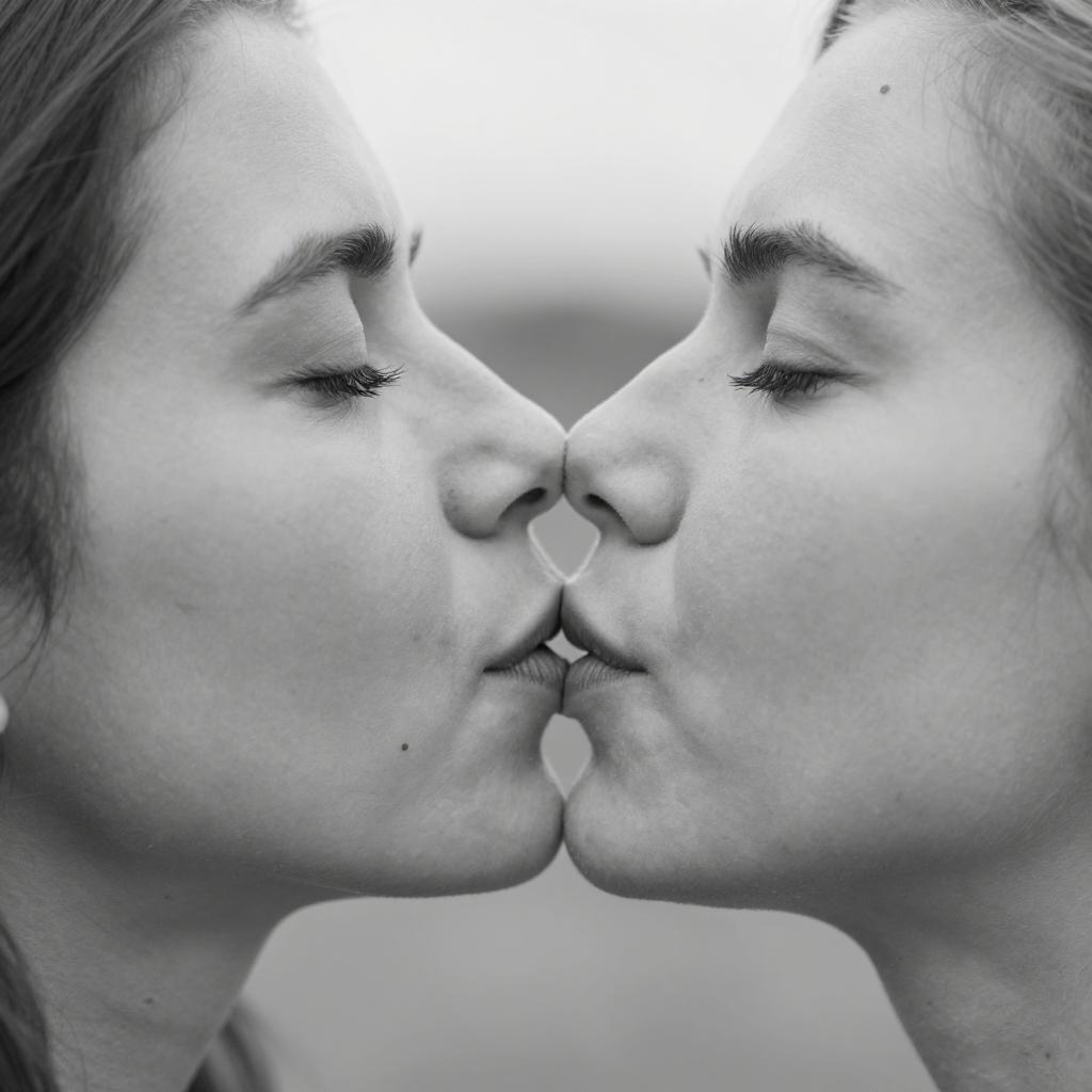 Black and white photograph of two men, close-up, kissing. Both have short, dark hair. Foreheads touch, eyes closed. Man on left has a small mole above his lip. Man on right has slightly lighter skin. Intense facial expressions. Upper bodies visible, no clothes.