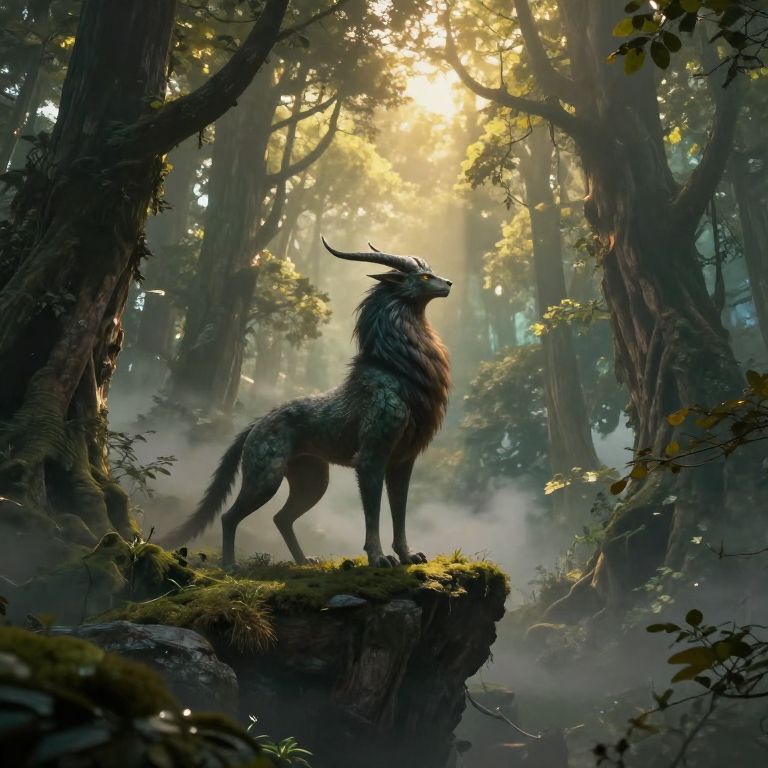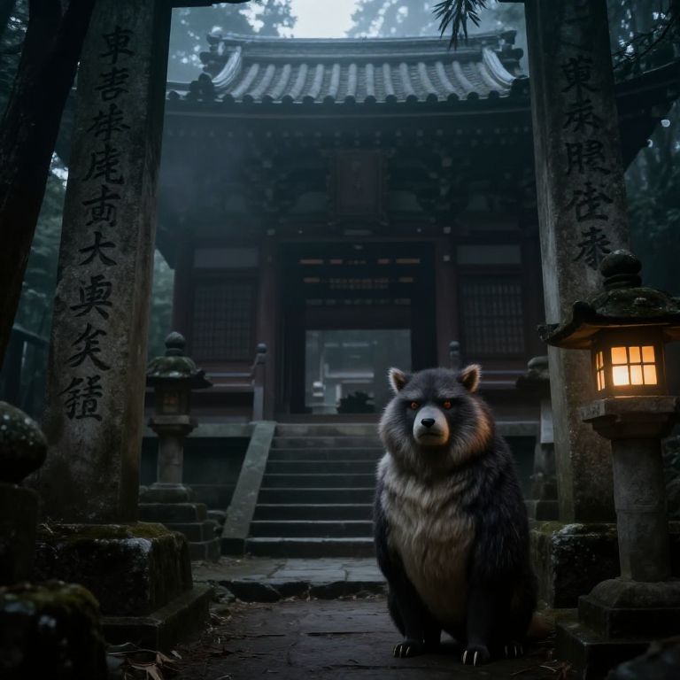 Nekoshoko kemono exploring a mysterious ancient temple hidden in mountains, stone pillars with faded kanji, dim lanterns casting shadows, mystical atmosphere, foggy air, traditional Japanese architecture, detailed facial expressions and fur patterns, Dall-E style.