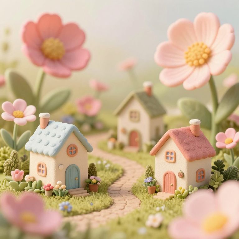 Small:ra4zqwyu_lo= in a whimsical miniature village scene, tiny houses nestled among oversized flowers, soft pastel colors, delicate details, warm morning light, fantasy style with intricate textures and serene atmosphere