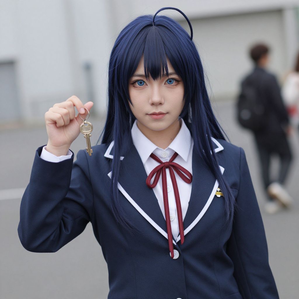 Photograph of a Japanese woman in a black school uniform with blue hair, holding a key, outdoors with blurred background.