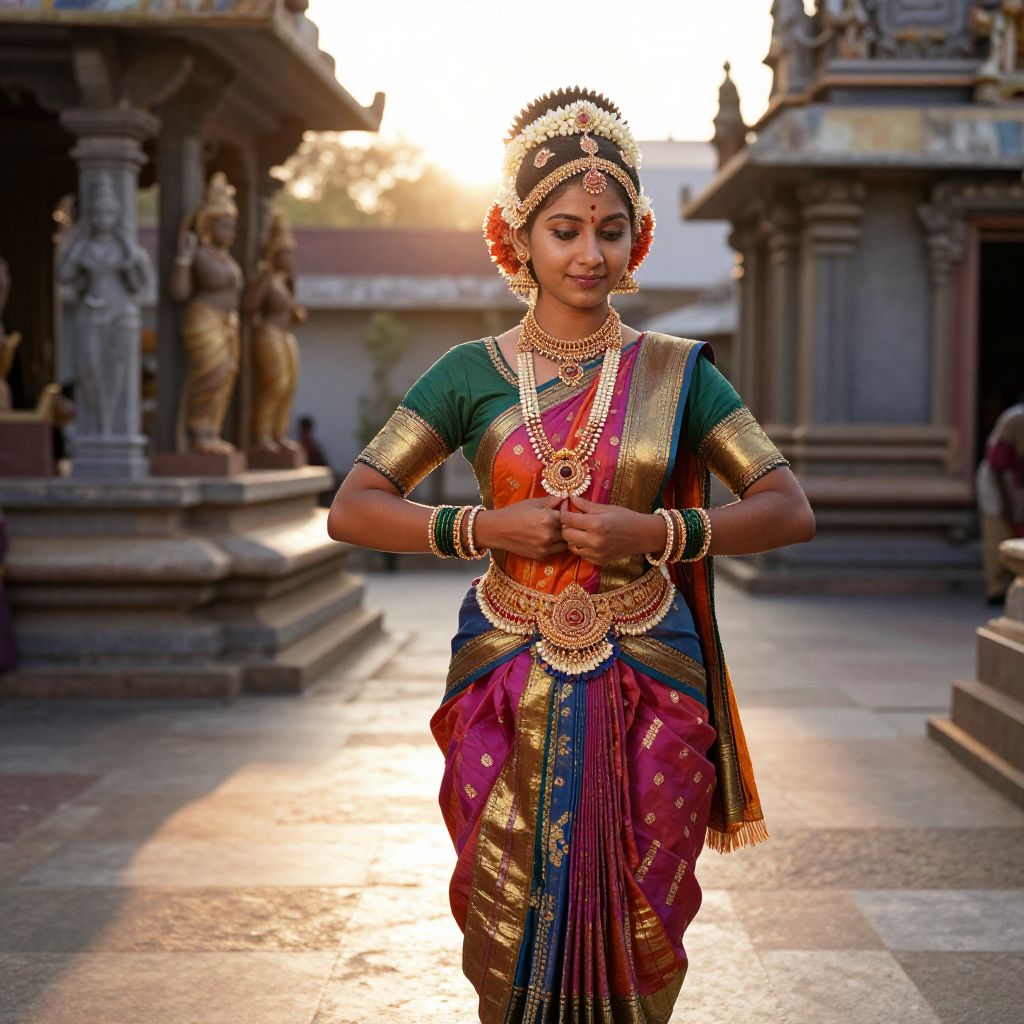 Photograph of a South Indian woman in traditional attire, adorned with gold jewelry, standing in a sunlit temple courtyard.
