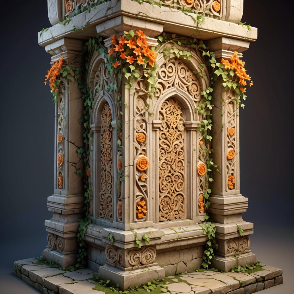 A tall, intricately carved stone pillar featuring detailed fantasy-style architectural reliefs, adorned with natural green vines and vibrant orange flowers. The warm-toned stone surface shows signs of cracking and weathering, standing firmly on a cracked stone base. Soft diffused lighting highlights the textures and elaborate designs of this fantasy environment element.