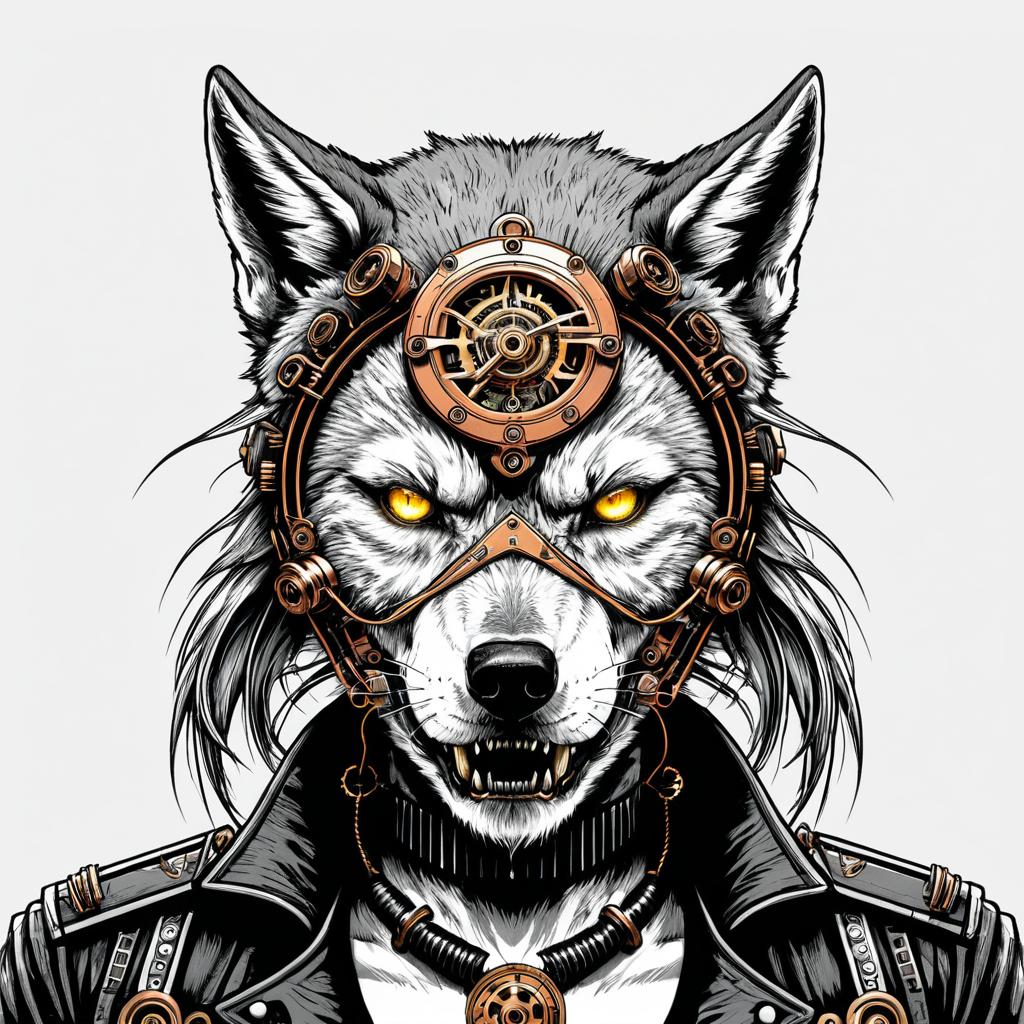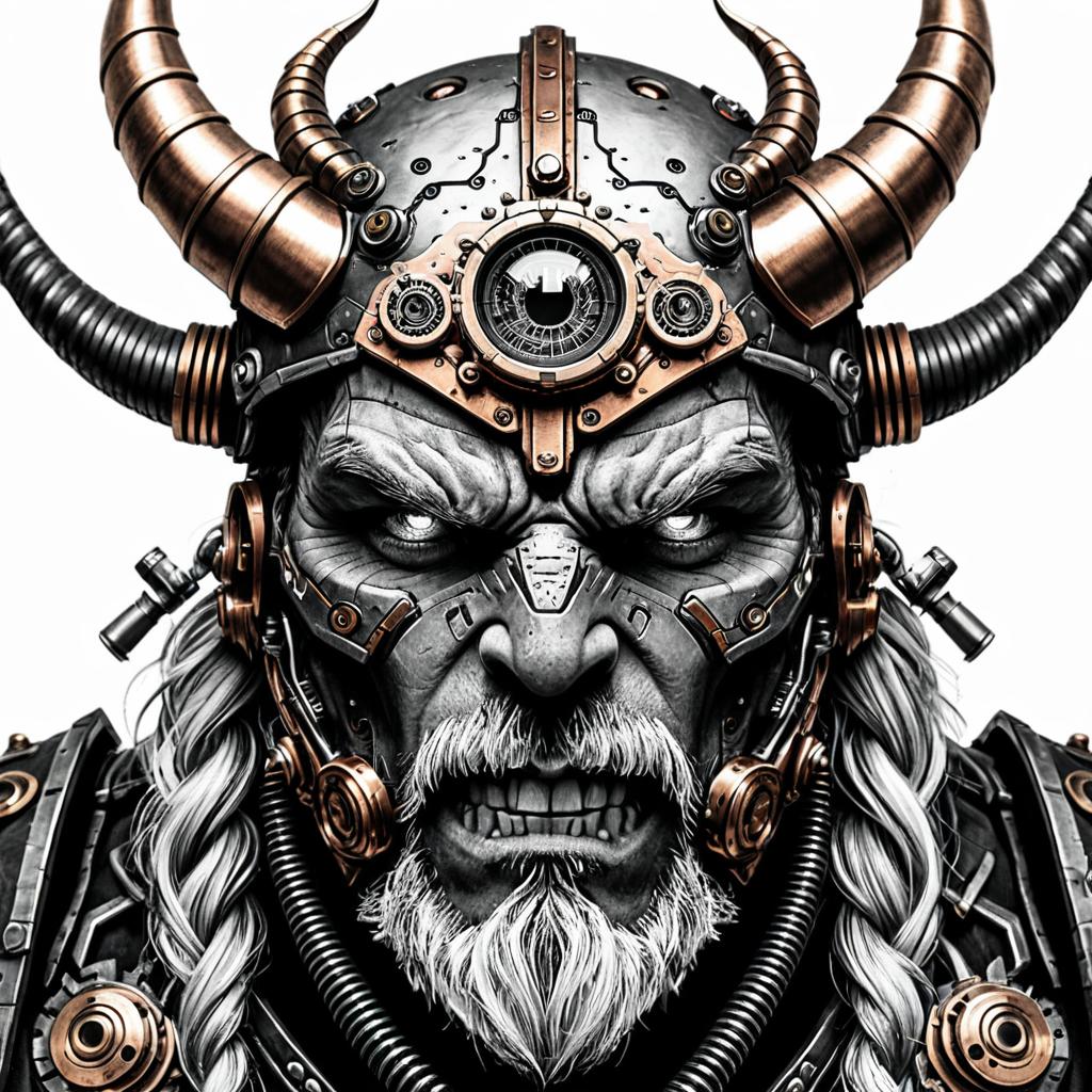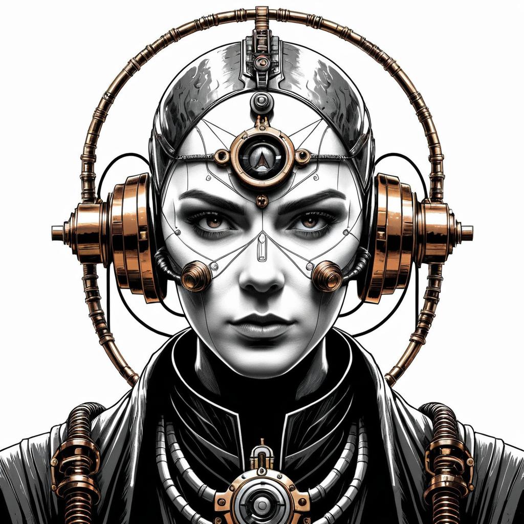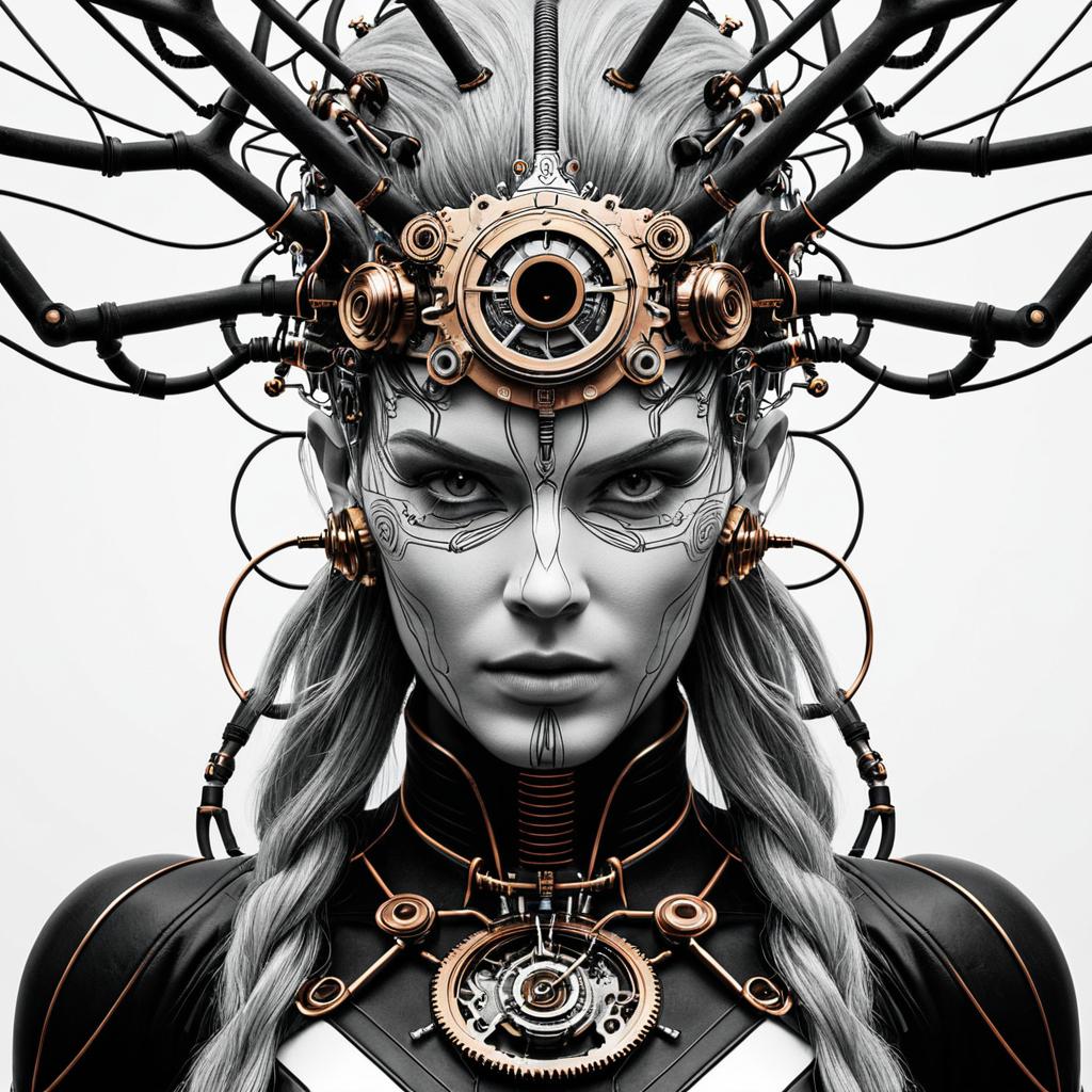 Mountain crest emblem line art, grayscale, realistic photo, two-dimensional 32K render, female samurai warrior with cyborg eye, steampunk brass piping and copper wiring plunging into exposed skull cavity, human mind merged with AI circuits, super intelligent, white beard, angry glare, white eyes, white background.