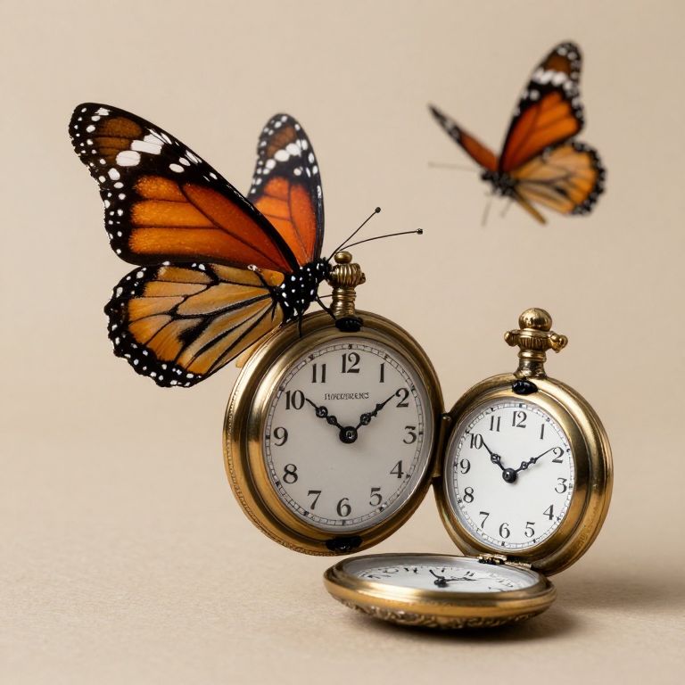 Photograph of two vintage, gold pocket watches with white faces and black numerals, one open and one closed, positioned on a beige surface. A vibrant orange and black monarch butterfly with white spots perches on the open watch, while another butterfly, slightly out of focus, hovers in the background. The watches cast soft shadows, and the image has a dreamy, whimsical feel with high contrast and vivid colors. The background is a plain, light beige.