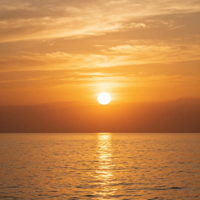 Photograph of a vibrant sunset over a calm ocean. The sun, glowing intensely in bright orange, sits low on the horizon, casting a warm, golden reflection across the gently rippling water. The sky is filled with layers of orange and yellow hues, blending into a subtle gradient of darker shades towards the top. Wispy clouds stretch horizontally, adding texture to the sky. The horizon is a thin, dark line where the sky meets the ocean. The overall scene evokes a sense of tranquility and natural beauty.