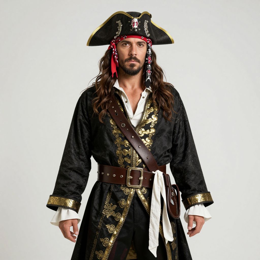 Traditional Pirate Costume, pirate in a black and gold outfit with a red bandanna