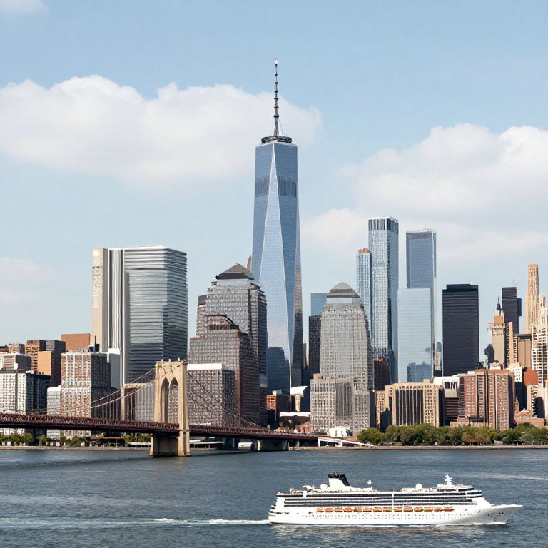 Photograph of a sunny day in New York City, showcasing a bustling skyline with the One World Trade Center prominently rising in the center. Surrounding skyscrapers vary in height and design, featuring modern glass facades and older brick buildings. A white ferry boat with visible passengers glides across the calm, blue river in the foreground, with a brown bridge spanning the water. The sky is clear with light blue hues, enhancing the city's vibrant urban atmosphere.
