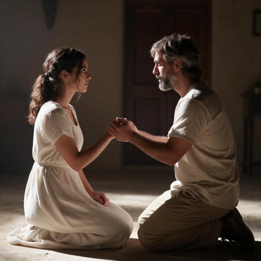 A man with gray hair and beard kneels, holding the hand of a woman with dark hair tied in a ponytail. The woman is wearing a white dress. They are in a dimly lit rustic room with stone walls and a wooden door in the background. Sunlight streams in from the left, highlighting their intense expressions.