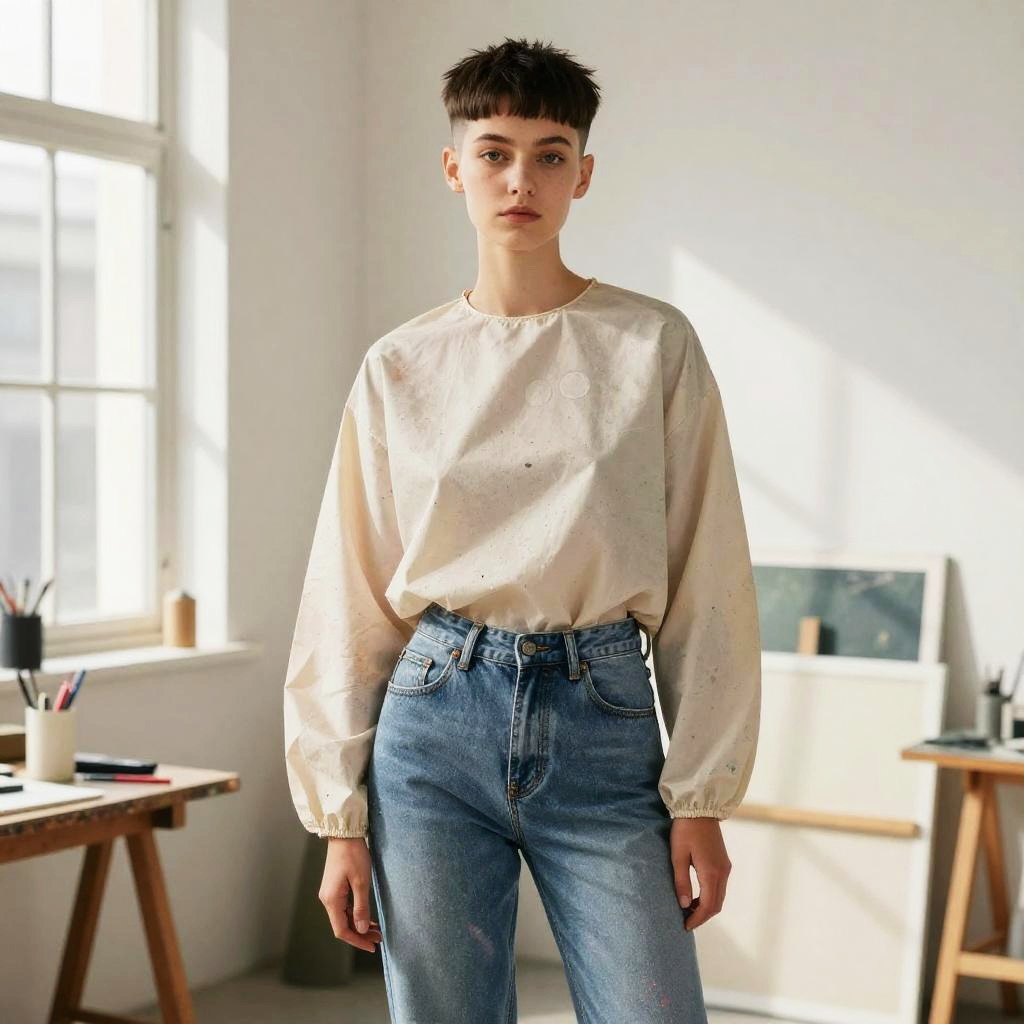 High Fade hairstyle on teenage girl, wearing flowy bohemian blouse and jeans, in urban graffiti wall, captured in fashion editorial style with hard light.