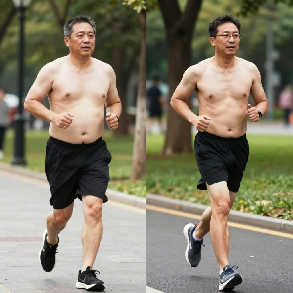 Weight loss filter transforming a before and after urban casual photo of a middle-aged man jogging in the park, highlighting slimmer physique, defined muscles, vibrant greenery background, dynamic motion blur, realistic yet optimistic atmosphere.
