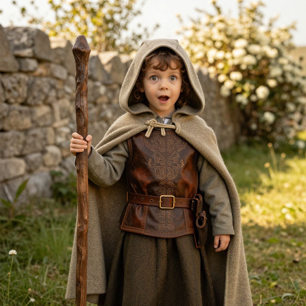 A young child is dressed in a medieval costume with a hood and a long skirt, wearing a detailed leather jerkin with embroidered patterns, a woven woolen cloak tied at the shoulders, and a wooden staff resting in one hand. The child has bright, curious eyes, curly brown hair peeking out from under the hood, and a playful expression, standing in a sun-dappled meadow surrounded by ancient stone walls and flowering bushes. The scene is rich in warm, golden-hour lighting, evoking a sense of wonder and timeless magic.