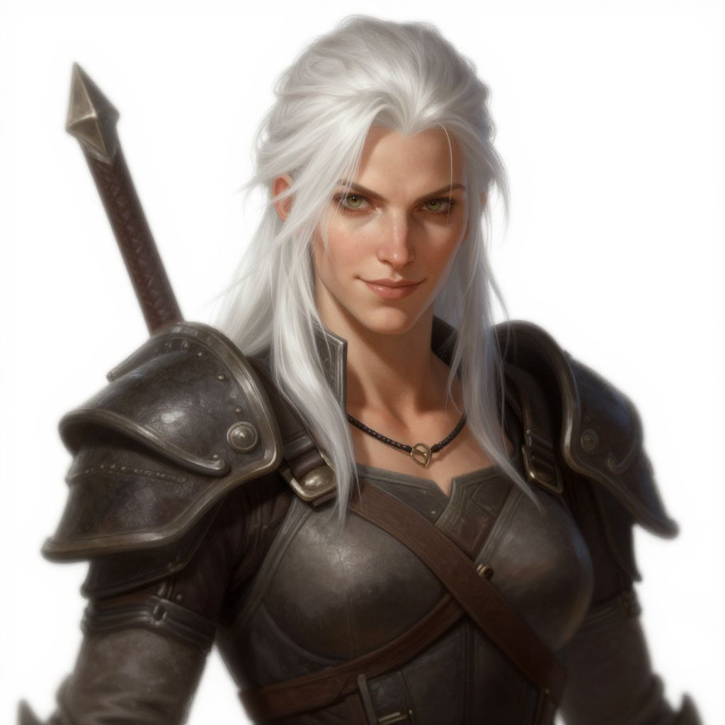 Frank Martin dnd rugged loking female human pale, white hair, softly smiling, fierce, by daniel f gerhartz,