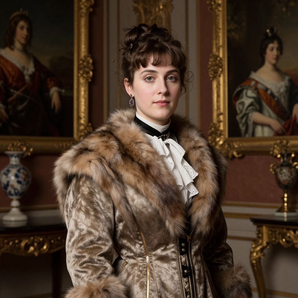 Photograph of a fair-skinned woman with dark, curly hair styled in an updo, wearing a luxurious brown fur coat over a white bow-tied blouse. She stands in a richly decorated room with ornate gold-framed paintings of other women in period attire in the background. The room features dark red walls and a white wainscot. A blue-and-white vase sits on a golden table to her left. The lighting is soft, highlighting her confident expression and elegant attire, evoking a vintage, aristocratic style.