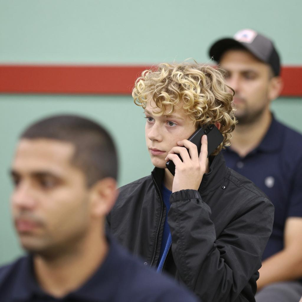 A teenage boy with curly blonde hair wearing a black jacket is holding a black smartphone to his ear, looking calmly to the side. The background features a mint green wall with a red horizontal stripe. Two men, one with dark hair in the foreground and another wearing a cap in the background, are out of focus. The setting appears to be an indoor public or communal space.