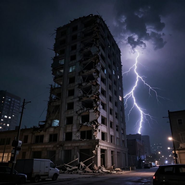 Photograph of a dark, stormy night featuring a tall, ruined, multi-story building with shattered windows and exposed, jagged debris. Brilliant white lightning bolts strike from a cloud-filled sky, illuminating the scene with intense light. The building's facade is cracked and partially collapsed, with debris scattered on the ground. In the foreground, a white van and a dark-colored car are parked on a street. The background includes other dark, unlit buildings and streetlights. The image conveys a dramatic, catastrophic atmosphere with contrasting dark and bright elements.