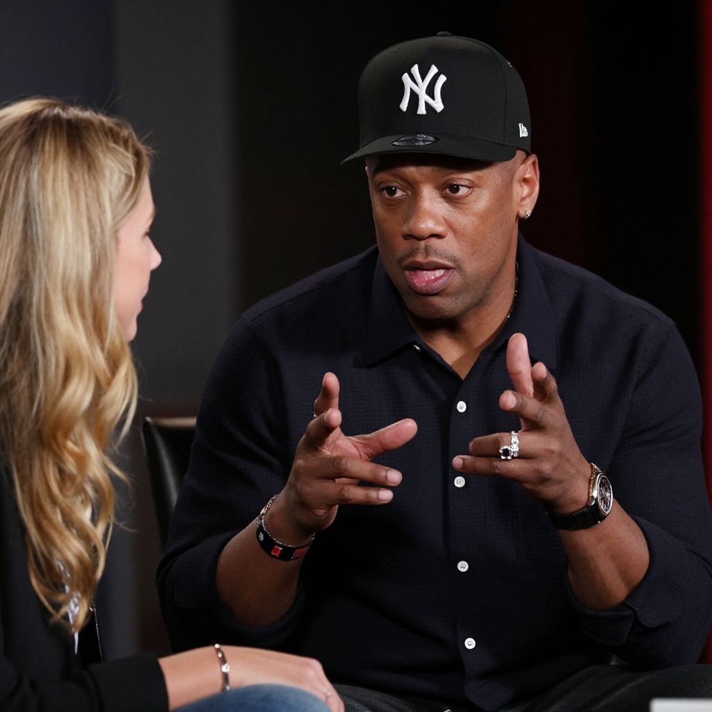 LL Cool J gestures animatedly while wearing a black New York Yankees cap and a dark button-up shirt, engaging in conversation with a blonde woman in a dimly lit indoor setting.