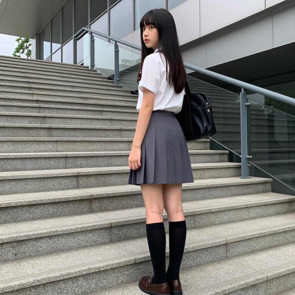 Photorealistic image of a Japanese schoolgirl standing on outdoor stairs by a modern building with glass windows. She has long black hair with bangs and is wearing a white short-sleeve shirt, a gray pleated skirt, black knee-high socks, and brown shoes. She carries a black backpack on her left shoulder and holds the gray metal stair railing with her right hand. The setting is daytime.