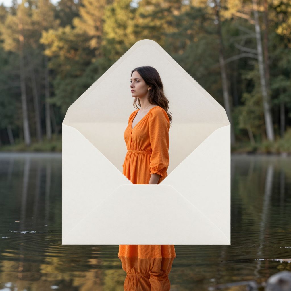 Enveloped in the embrace of nature’s serenity, a woman in vibrant orange stands as a symbol of freedom and introspection, her presence mirrored in the still waters of the lake, where the whispers of the forest and the warmth of sunlight intertwine.