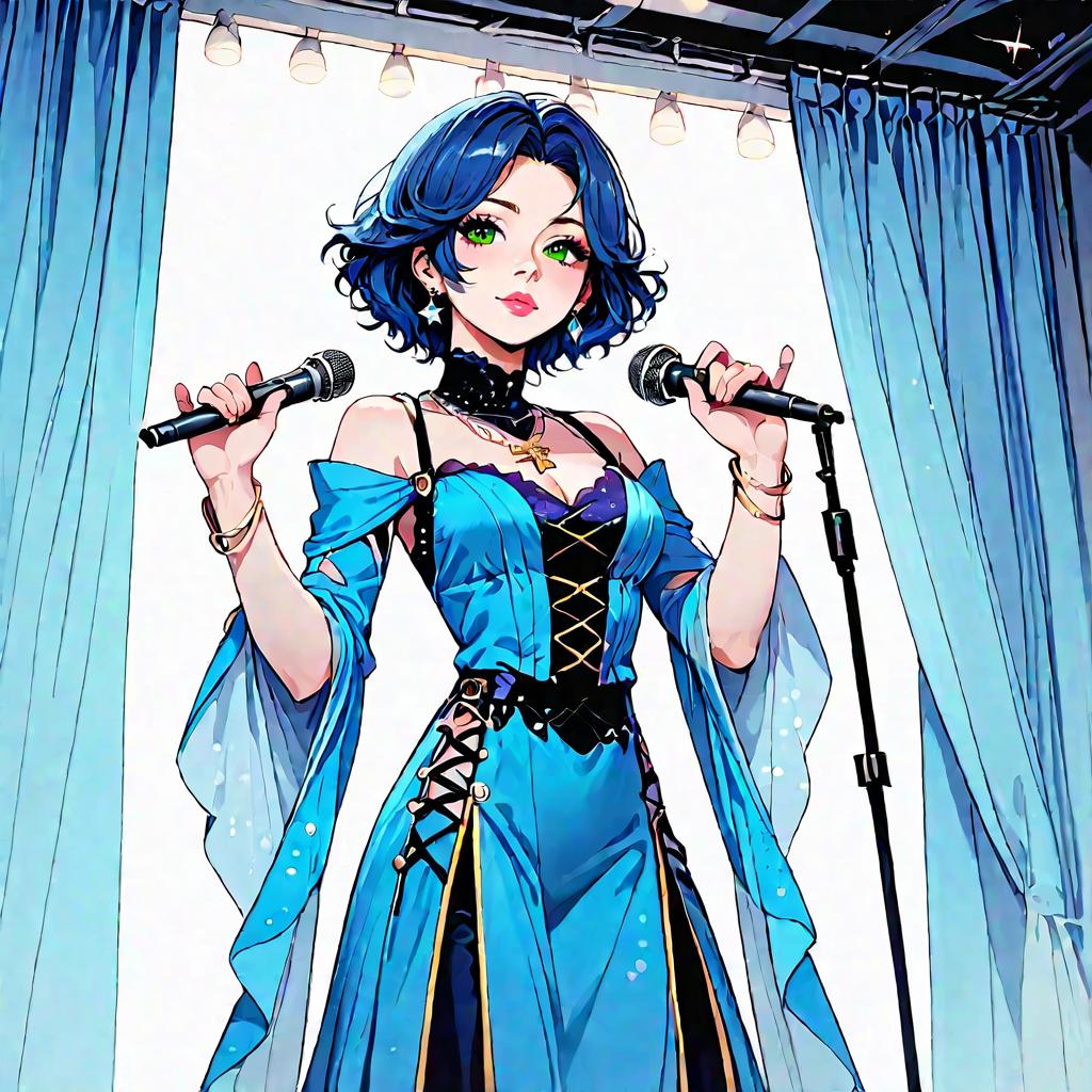 Digital illustration of a beautiful anime female idol with long brown hair and green eyes, singing passionately into a microphone on stage during a concert. She wears a blue and black idol costume with lace details, a matching shawl, jewelry including earrings, necklace, and bracelets. The stage is lit by bright spotlights with an audience in the background.