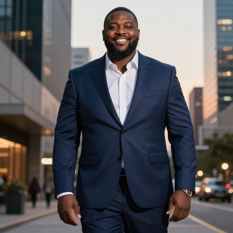 Fat black guy in suit sitting on a leather chair in a stylish office, wearing a gray pinstripe suit with a colorful tie, glasses, surrounded by books and plants, soft natural light