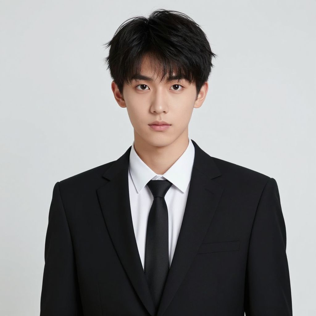 Young Asian man with black hair, golden crown, red cape, white shirt, black suit, neutral gray background, serious expression. Digital CGI image.