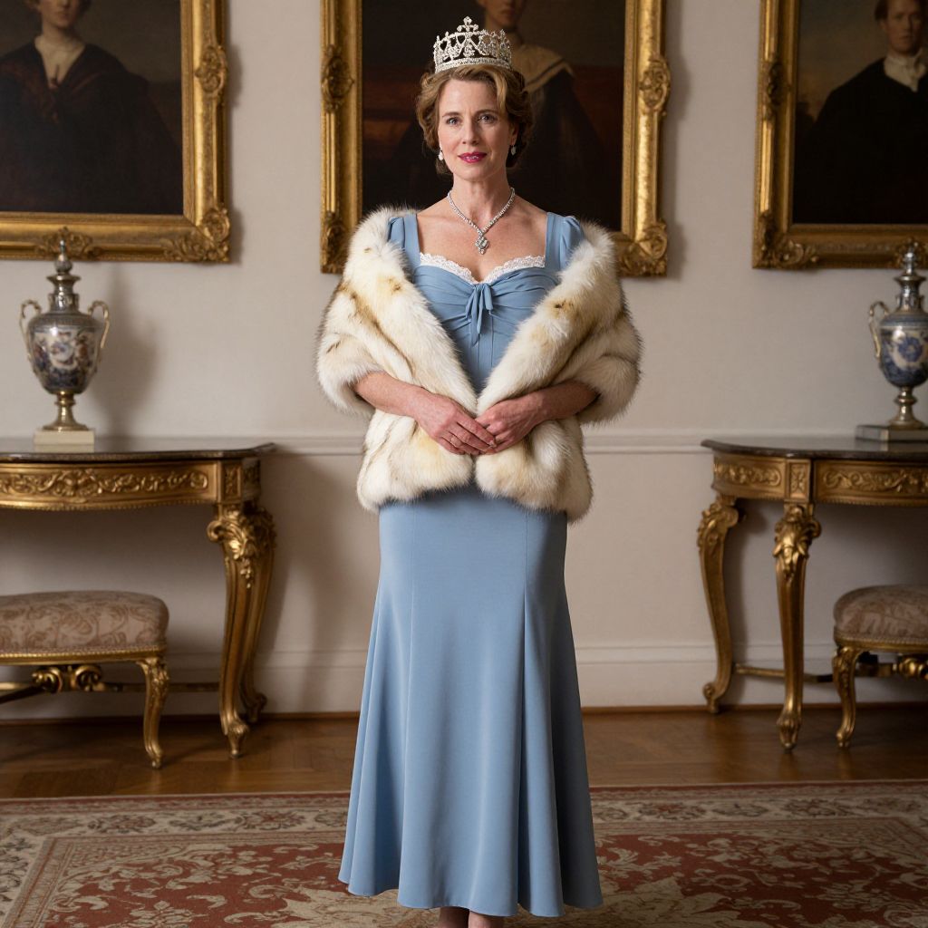 Reign Queen Mary Dress, a woman in a blue dress and fur stole standing in a room