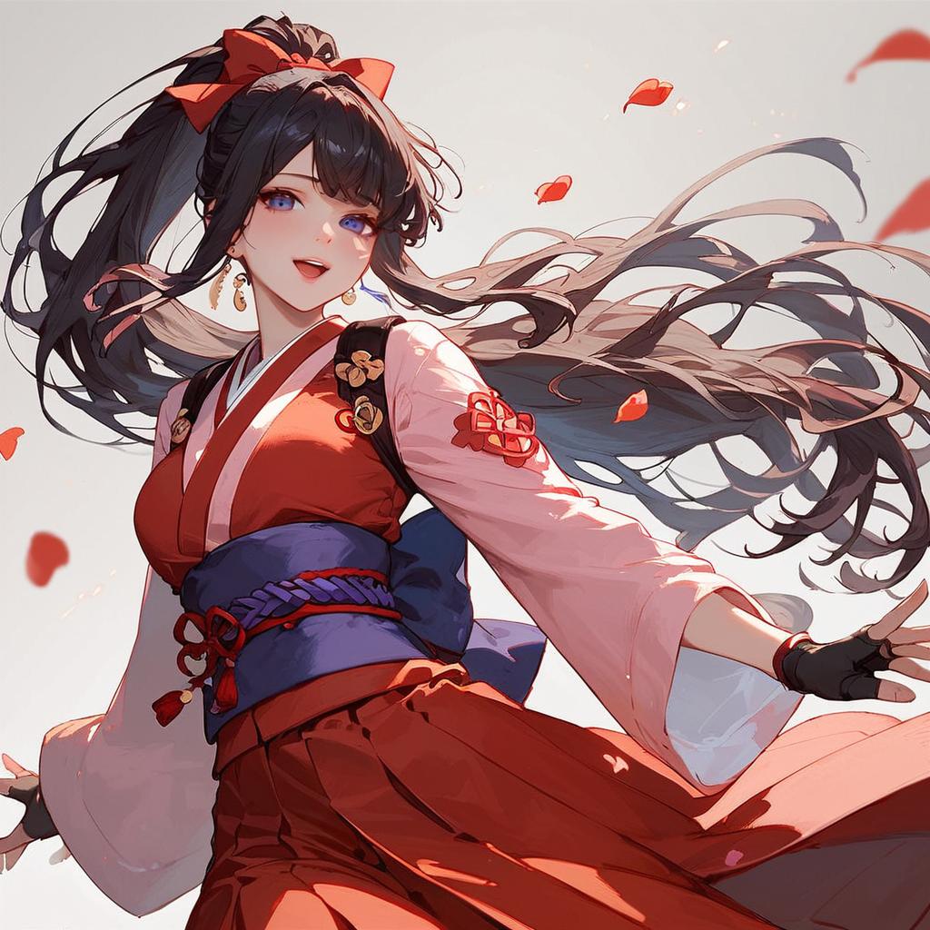 Detailed eyes, anime, 2d, score_9_up, score_8_up, score_7_up, (hill:1.3), (miko clothing:1.2), mechabare, skirt, bow, black hair, damaged, torn clothes, red bow, open mouth, mechanical parts, shirt, android, brown eyes, broken, breasts, lying, shoes, on back, medium breasts, navel, long hair, amputee, bangs