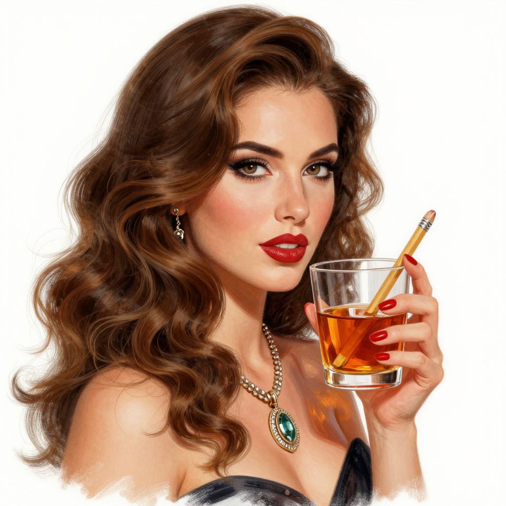 Digital artwork of a glamorous woman with wavy brown hair, red lipstick, and green pendant, holding a glass of amber liquid with a cigarette. White