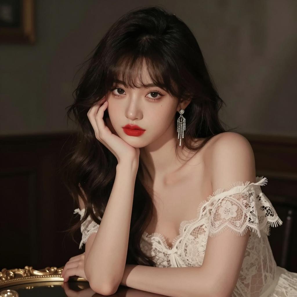 Digital illustration of a young woman with fair skin and brown eyes, wearing a colorful floral head wreath, large orange and white drop earrings, and an off-the-shoulder pink dress with blue and white floral patterns. She has pink blush on her cheeks and a neutral expression. Background includes a pink building and green plants. Bright sunlight illuminates the scene. Woman positioned in profile facing left.