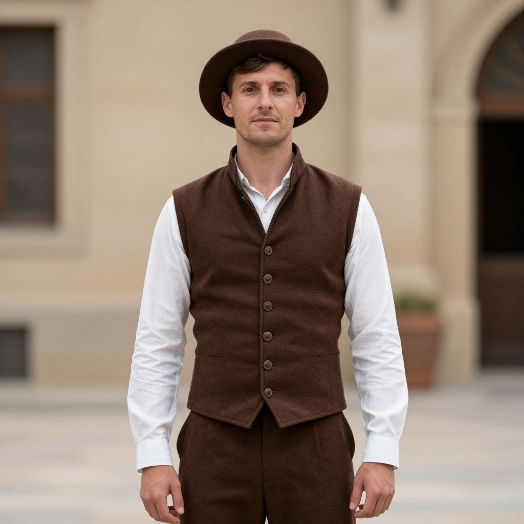 Renaissance Faire Costume Man, man in a brown vest and hat standing in front of a building