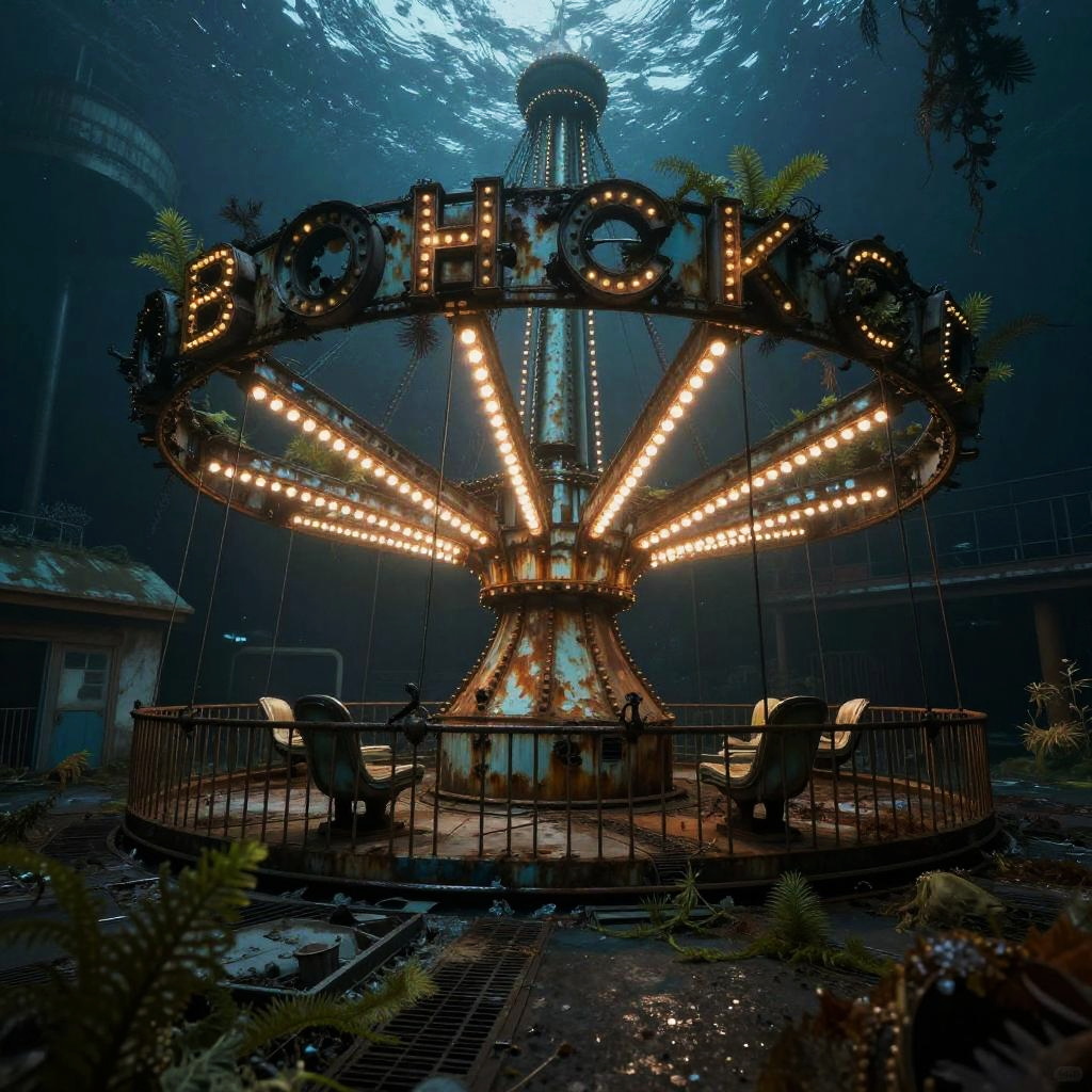 Bioshock aesthetic abandoned underwater amusement park with rusted rides, flickering lights, eerie atmosphere, sunken and overgrown with seaweed, moody color palette
