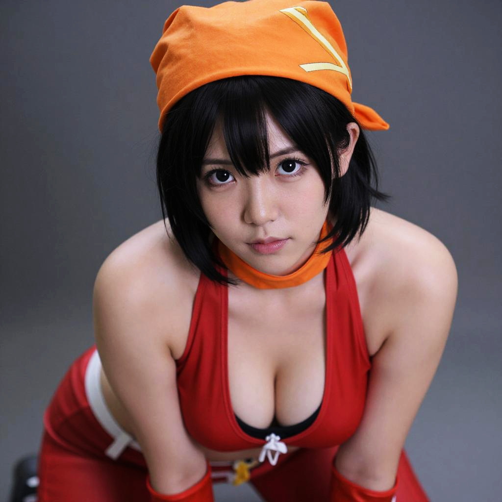 ((masterpiece, sidelighting, finely detailed beautiful eyes: 1.2)), (photorealistic:1.3), (((bent over, wearing red and loose low-cut top and breats slip from Neckline, Neckline open, cleavage, breasts))), ultra-detailed, ultra high res, professional lighting, perfect anatomy, perfect face, perfect eyes, pandballgt, black eyes, black hair, short hair, 1girl, gloves, orange bandana, fingerless gloves, pants, (japanese), (cosplay)