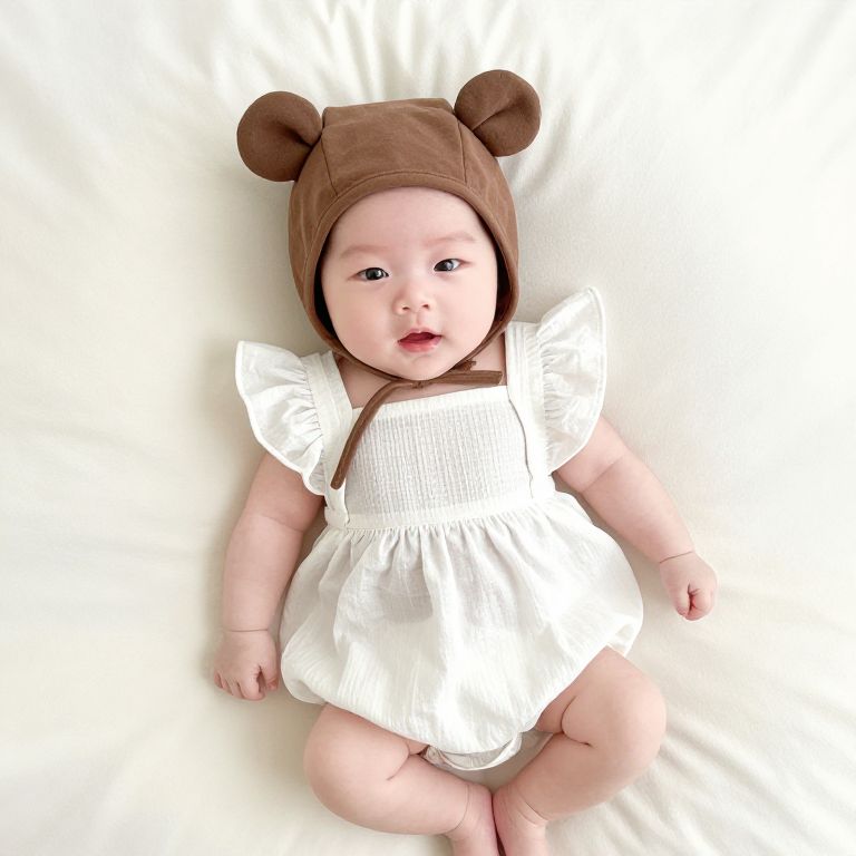 Photograph of a chubby, fair-skinned baby with rosy cheeks, lying on a white bed. The baby wears a white, ribbed, puffy-sleeved romper and a brown, bear-ear hat. The hat has two round brown ears on top, adding a cute, playful touch. The baby's small hands and feet are visible, with tiny pink toenails and fingernails. The baby's black eyes and slightly open mouth give a curious expression. The white bed sheets provide a clean, simple background, emphasizing the baby's outfit and adorable features. The image is brightly lit, highlighting the baby's soft skin and the textures of the clothing.