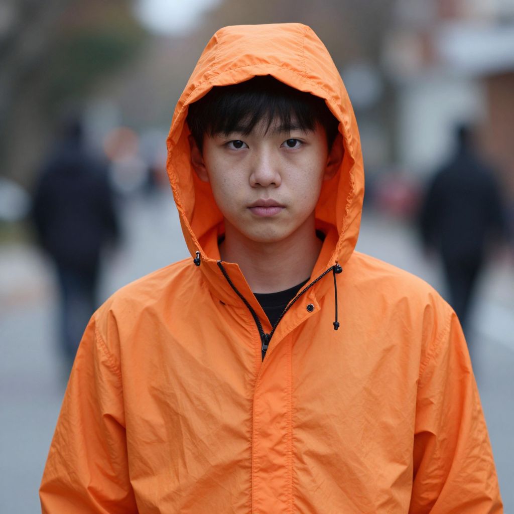 Photograph of an Asian teenage boy with straight black hair and fair skin, standing outdoors in a blurred urban background. He is wearing an orange, hooded, waterproof jacket with a black shirt underneath. His expression is neutral, with slightly parted lips and dark, focused eyes. The hood is slightly tilted forward, partially covering his forehead. The jacket is slightly crumpled, and the zipper is partially open. The background shows indistinct figures and buildings, suggesting a busy city street. The image has a shallow depth of field, making the boy in sharp focus while the background is blurred.