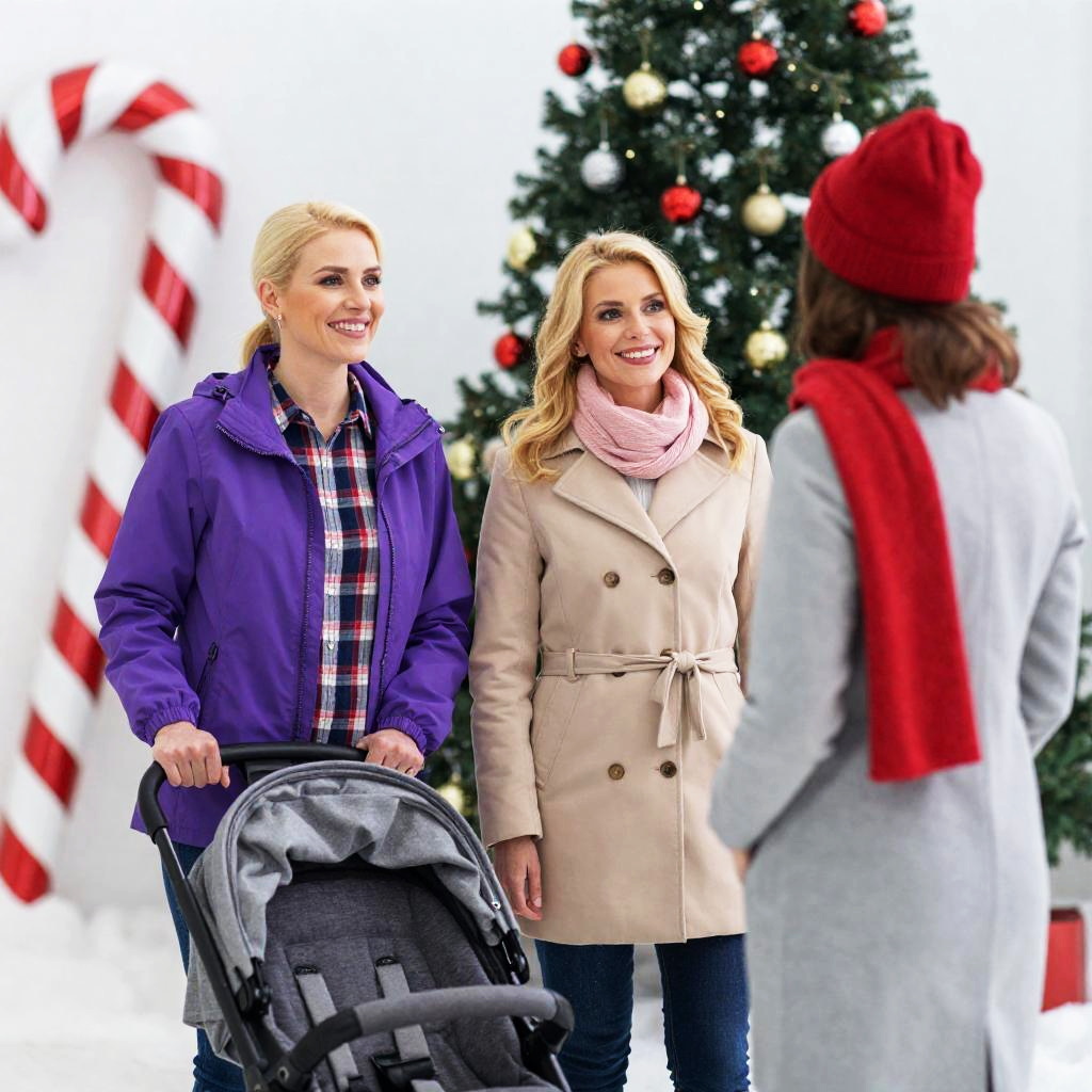 Photograph of two women in a festive indoor setting. Blonde woman in brown jacket and pink scarf stands slightly right, looking slightly to the left with a subtle smile. Brown-haired woman in purple quilted jacket and plaid shirt stands slightly left, smiling. Christmas tree with colorful lights and large candy cane in background. Snowy winter scene backdrop. Blonde woman holds beige gloves.