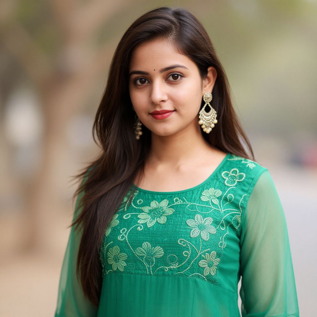 Photograph of a young South Asian woman with medium brown skin and wavy dark brown hair, wearing a maroon traditional kurti with intricate gold embroidery on the chest, sleeves, and neckline. She has a subtle smile, brown eyes, and is adorned with dangling gold earrings and a thin gold necklace. She stands outdoors in front of a blurred background featuring white flowers on the left and an orange tree on the right. The lighting is soft, casting a warm glow on her face. The overall composition is bright and vibrant, highlighting her traditional attire and natural beauty.