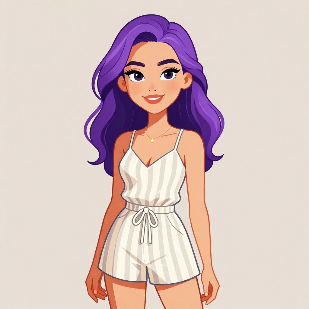Digital illustration of a young woman with fair skin and vibrant purple hair in a loose side braid. She has large, expressive blue eyes, and wears a white, long-sleeved, ribbed top with a matching white drawstring shorts set. She completes her outfit with white slip-on sandals. She stands against a white background, exuding a cute, relaxed vibe. Her lips are slightly parted, and she wears large, silver hoop earrings. The art style is colorful and cartoonish, with bold outlines and a slight anime influence.
