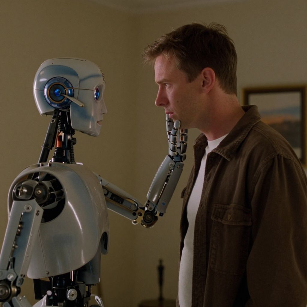 Photograph of a man in a brown jacket facing a silver humanoid robot with blue eyes, robot touching man's chin in a dimly lit room.