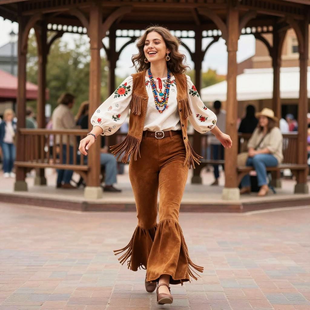 70s outfits: charismatic folk singer with a heartfelt smile dressed in a fringed suede vest over a paisley blouse, bell-bottom pants, and beaded accessories, walking through a rustic outdoor gathering under string lights.