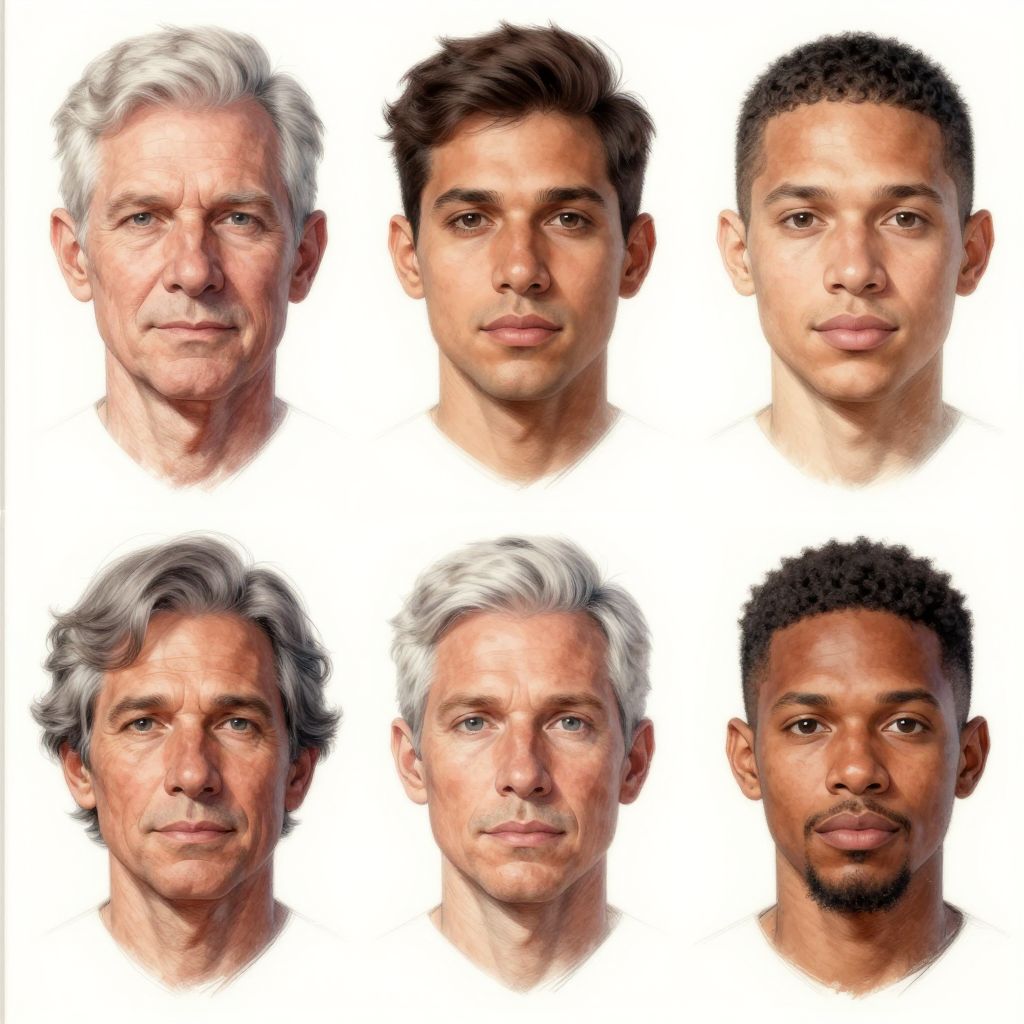 This digital illustration features six realistic, digitally-rendered headshots of different men against a white background. The top row includes a white man with gray hair, a brown-haired man with a short, wavy haircut, and a black man with short, curly hair. The bottom row shows a white man with gray hair, a white man with slightly longer gray hair, and another black man with a short, curly hairstyle and a small beard. Each headshot captures detailed facial features, including expressions, skin textures, and hair styles, with a focus on realistic representation.